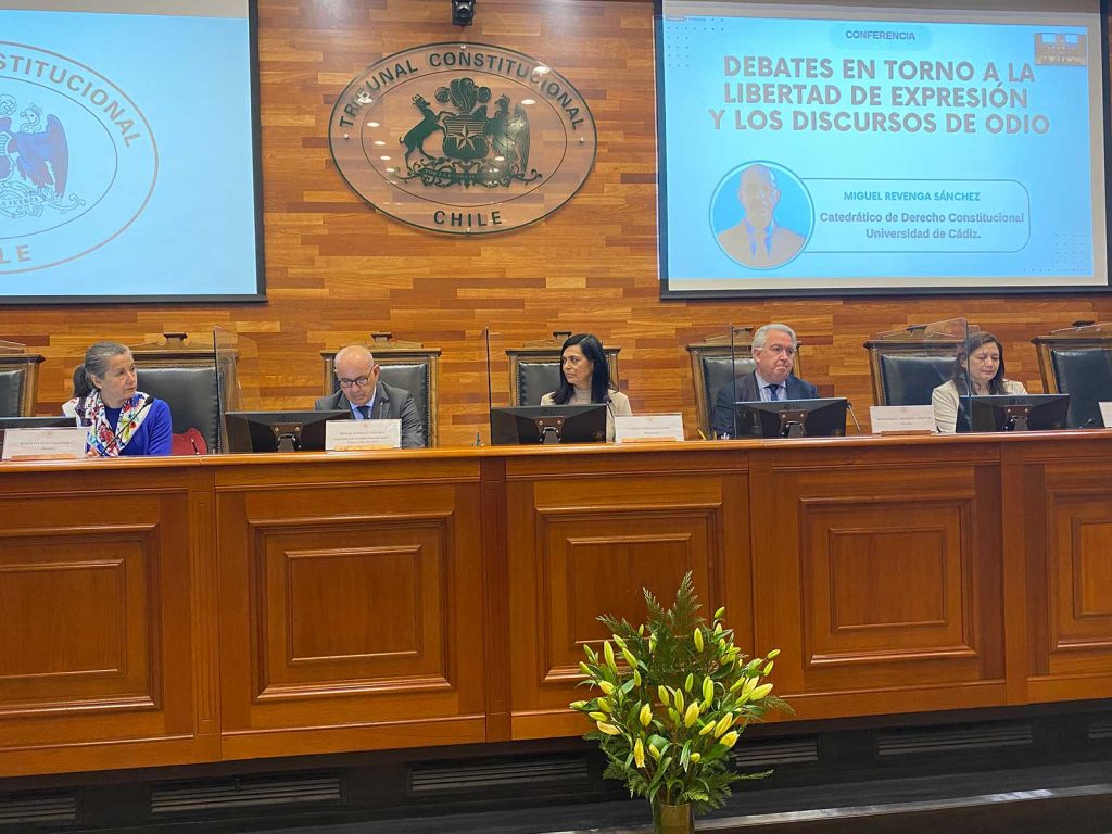El catedrático de Derecho Constitucional de la Universidad de Cádiz, Miguel Revenga Sánchez, dictó la conferencia “Debates en torno a la libertad de expresión y los discursos de odio” este 5 de septiembre en la Sala de Audiencias del Tribunal Constitucional. Asistieron la Presidenta del Tribunal Constitucional, Ministra Nancy Yáñez, la Ministra María Pía Silva, El Ministro Miguel Ángel Fernández, la Ministra Daniela Marzi y la Suplente de Ministro, Sra. Natalia Muñoz. Además, se contó con la presencia de la Directora del Museo de la Memoria, Sra. María Fernanda García; la Directora de Derechos Humanos de la Fiscalía Nacional, Sra. Alejandra Seguel; la abogada de la Defensoría Penal Pública, profesora Ingrid Kaempfe y del Señor Francisco Estévez, ex Director del Museo de la Memoria. A la actividad académica también fueron invitados los profesionales, funcionarios y funcionarias de esta Magistratura.