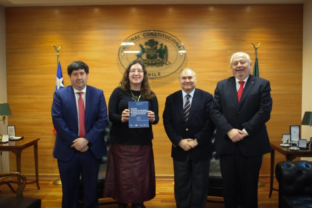 El miércoles 22 de abril la Presidenta del Tribunal Constitucional, Ministra Daniela Marzi Muñoz, recibió la visita de destacados juristas, quienes vinieron a presentarle los tres tomos elaborados con las «Actas Grupo de Estudios Constitucionales ‘Grupo de los 24′». El producto académico es el resultado del trabajo colaborativo que duró más de dos años, entre la Asociación Chilena de Derecho Constitucional (ACHDC), el Centro de Estudios del Desarrollo (CED), la Facultad de Ciencias Jurídicas y Sociales de la Universidad de Concepción (UdeC) y la Facultad de Derecho de la Universidad de Chile (UCH).