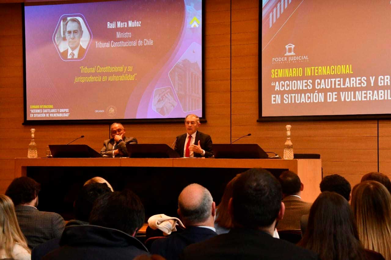 El jueves 22 de agosto se realizó el Seminario “Acciones cautelares y grupos en situación de vulnerabilidad” con el objetivo de analizar el rol de las medidas cautelares en la protección de los derechos humanos y presuntas vulneraciones que sufren las personas y grupos en situación de vulnerabilidad, desde el punto de vista de la segunda y tercera sala de la Corte Suprema, como también del Tribunal Constitucional (TC), la Corte IDH y el derecho español. El ministro Raúl Mera Muñoz participó en el segundo panel sobre “La evolución del recurso de amparo de personas y grupos vulnerables” y al respecto señaló que esta Magistratura “no conoce de acciones cautelares, pero se aproxima a la vulnerabilidad de manera indirecta a través de diversas acciones y competencias que le corresponden, principalmente el requerimiento de inaplicabilidad”. También se refirió a algunos casos particulares que, sobre el tema del seminario, ha conocido este Tribunal.