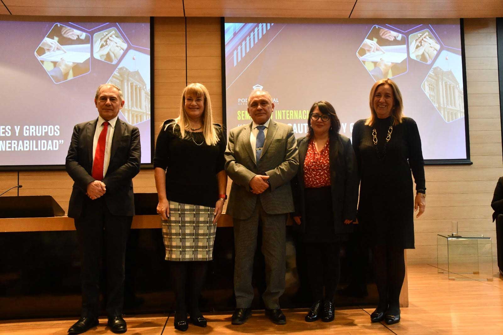 Las palabras inaugurales estuvieron a cargo del ministro de la Corte Suprema (CS), Sr. Mario Carroza, y la subsecretaria de Derechos Humanos, Sra. Daniela Quintanilla. Luego, se desarrolló el primer panel con la exposición de la invitada especial Carmen Perez de Ontiveros, académica de la Universidad de Las Palmas de la Gran Canaria (España), quien se refirió a las acciones cautelares en el sistema español. “El acceso a la justicia de las mujeres privadas de libertad en la jurisprudencia de la Corte IDH”, fue el tema de la académica de la Universidad de Valparaíso, Marcela Aedo. Cerró este primer panel la ministra de CS, Sra. Ángela Vivanco, quien se refirió al “acceso a la justicia de personas en situación de vulnerabilidad en la jurisprudencia de la tercera sala”.