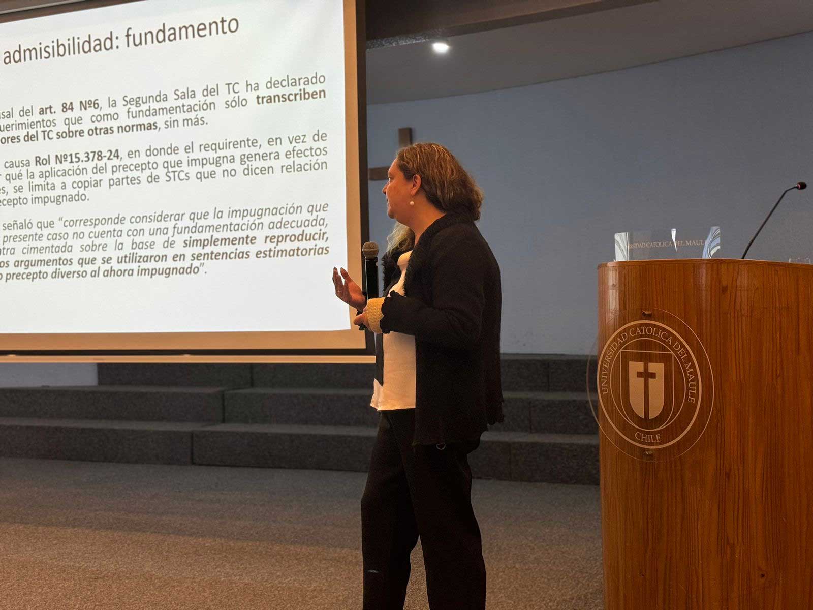 El viernes 7 de junio la Ministra del Tribunal Constitucional (TC), Marcela Peredo Rojas, participó en el seminario “Estado de Derecho y justicia constitucional”, realizado en el aula magna de la Universidad Católica del Maule (UC Maule), en Talca. La actividad académica fue inaugurada por la Decana de la Facultad de Ciencias Sociales y Económicas de esa universidad, María Haydée Fonseca Mairena.