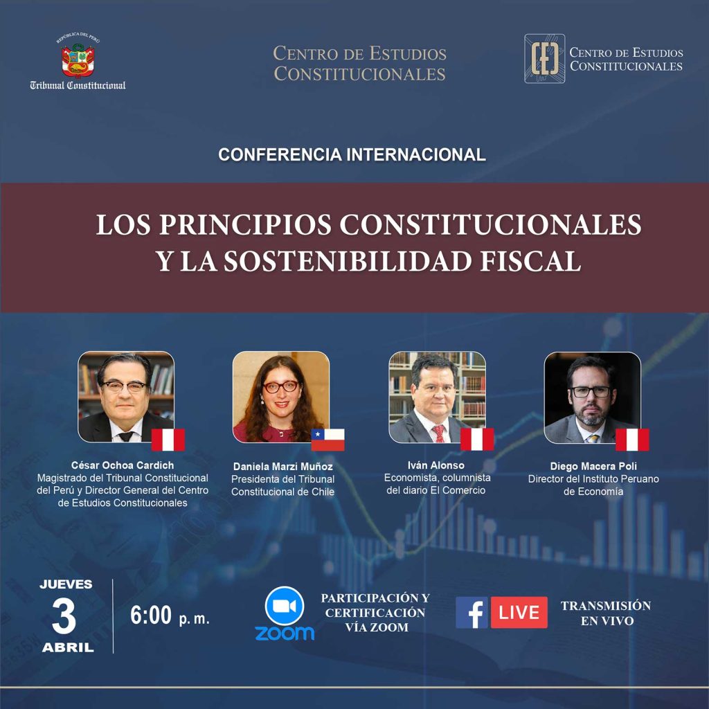 La Presidenta del Tribunal Constitucional, ministra Daniela Marzi Muñoz, fue invitada por el Centro de Estudios Constitucionales (CEC) del Tribunal Constitucional del Perú (TCP) a exponer en la conferencia Internacional “Los principios constitucionales y la sostenibilidad fiscal», que se realizó, vía telemática, el 3 de abril. La actividad académica fue moderada por la directora académica del CEC, María Candelaria Quispe Ponce, y tuvo como panelistas al Magistrado del Tribunal Constitucional (TC) del Perú y director general del CEC, César Ochoa Cardich; al director del Instituto Peruano de Economía, Diego Macera Poli; y al economista y columnista del diario El Comercio, Iván Alonso.